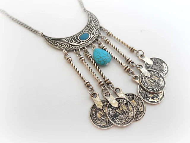 No sé porque yo siempre asocio el boho-chic con el verano, la playa, fiestas, reuniones con amigos.. y es que el colgante que nos traes con esas monedas tan chulas y las turquesas tan alegres no hacen más que reafirmarme en esa idea.